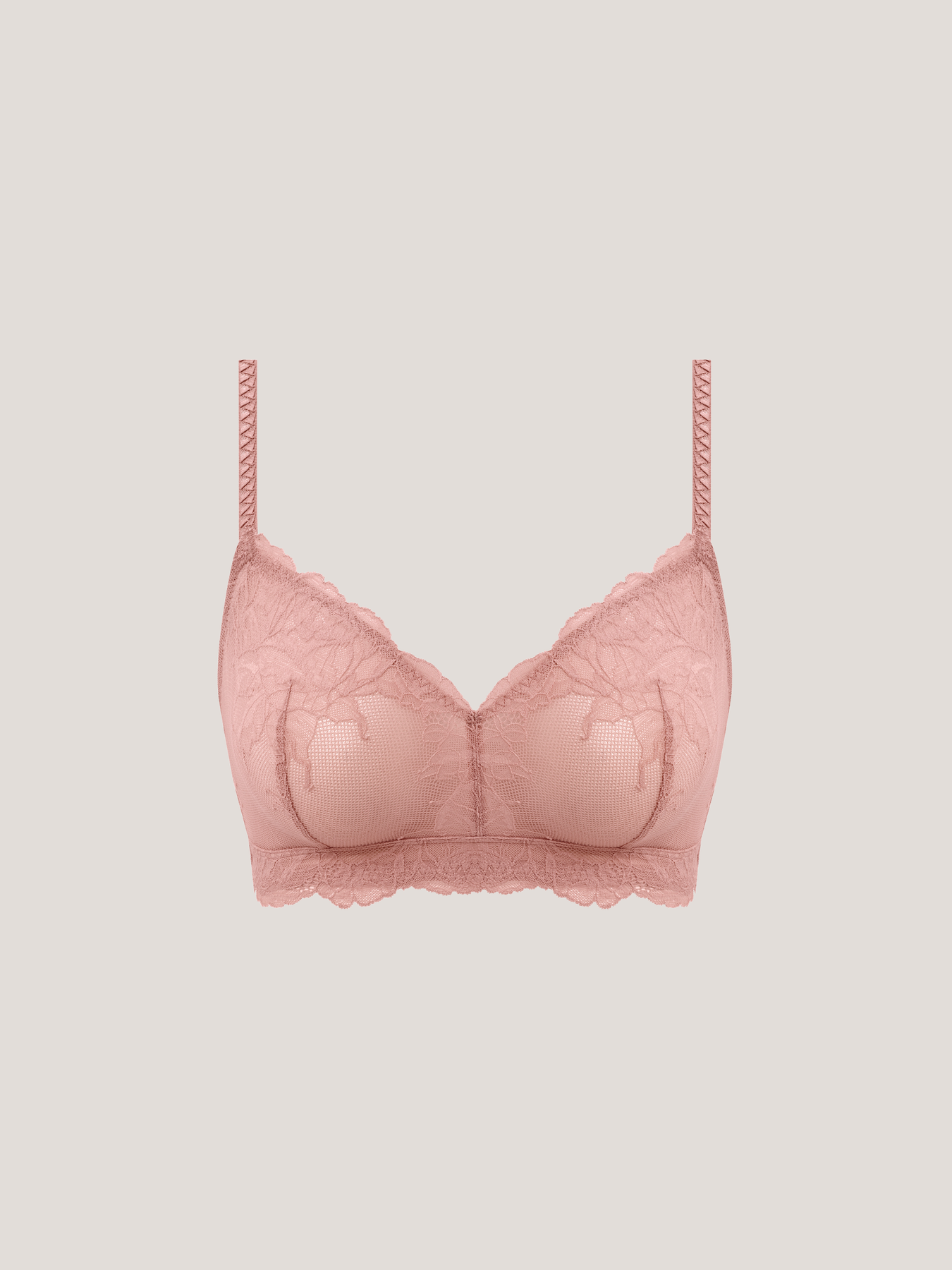 Sujetador sin aros con encaje con un llamativo estampado floral. Cuenta con sujeciones laterales para mayor sujeción.
