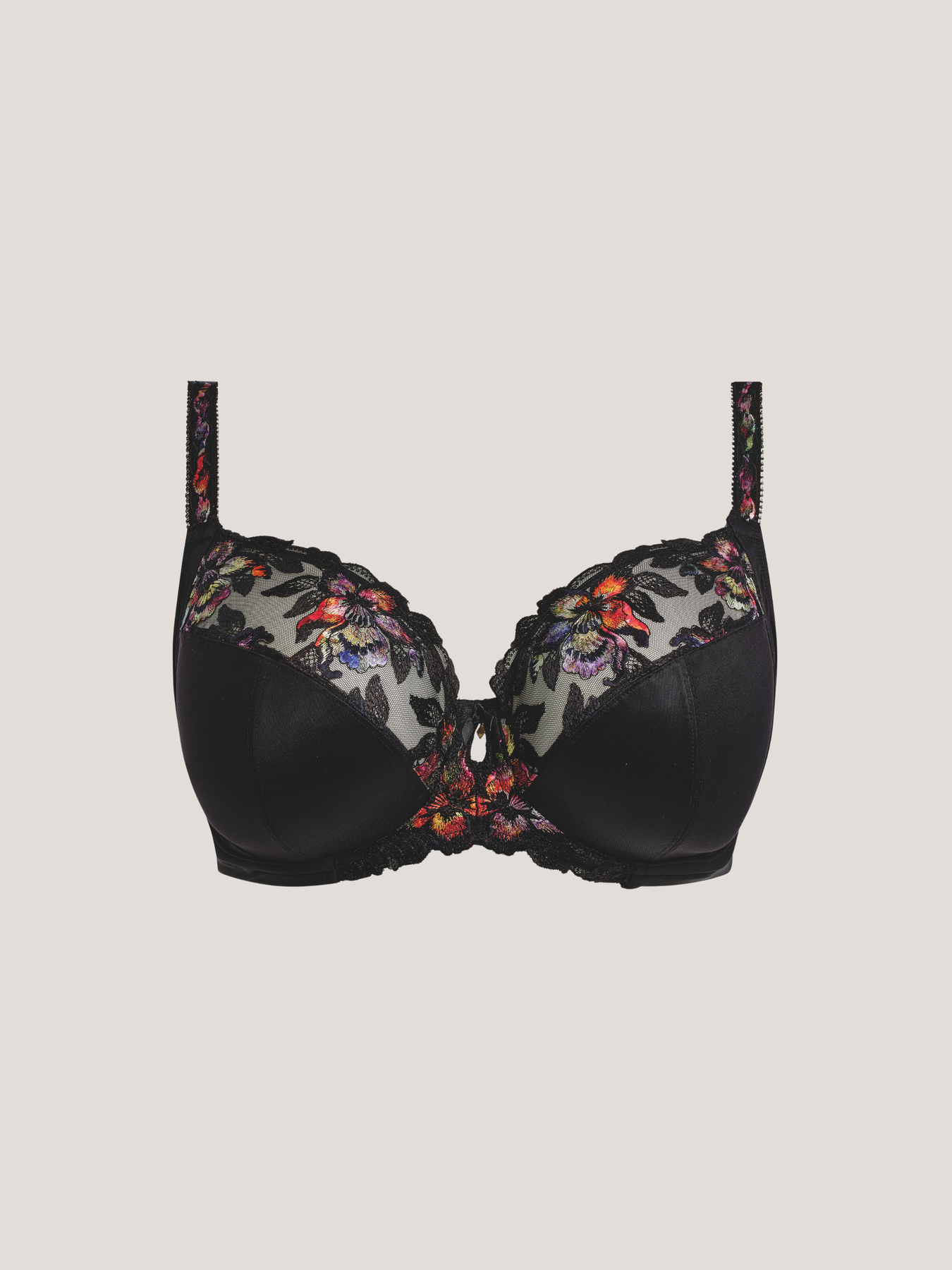 Descubre un delicado bordado floral en tonos vibrantes inspirados en el atardecer, que destaca sobre una base negra contrastante. Los hilos de lúrex dorado recorren el bordado, aportando un acabado brillante y sofisticado.